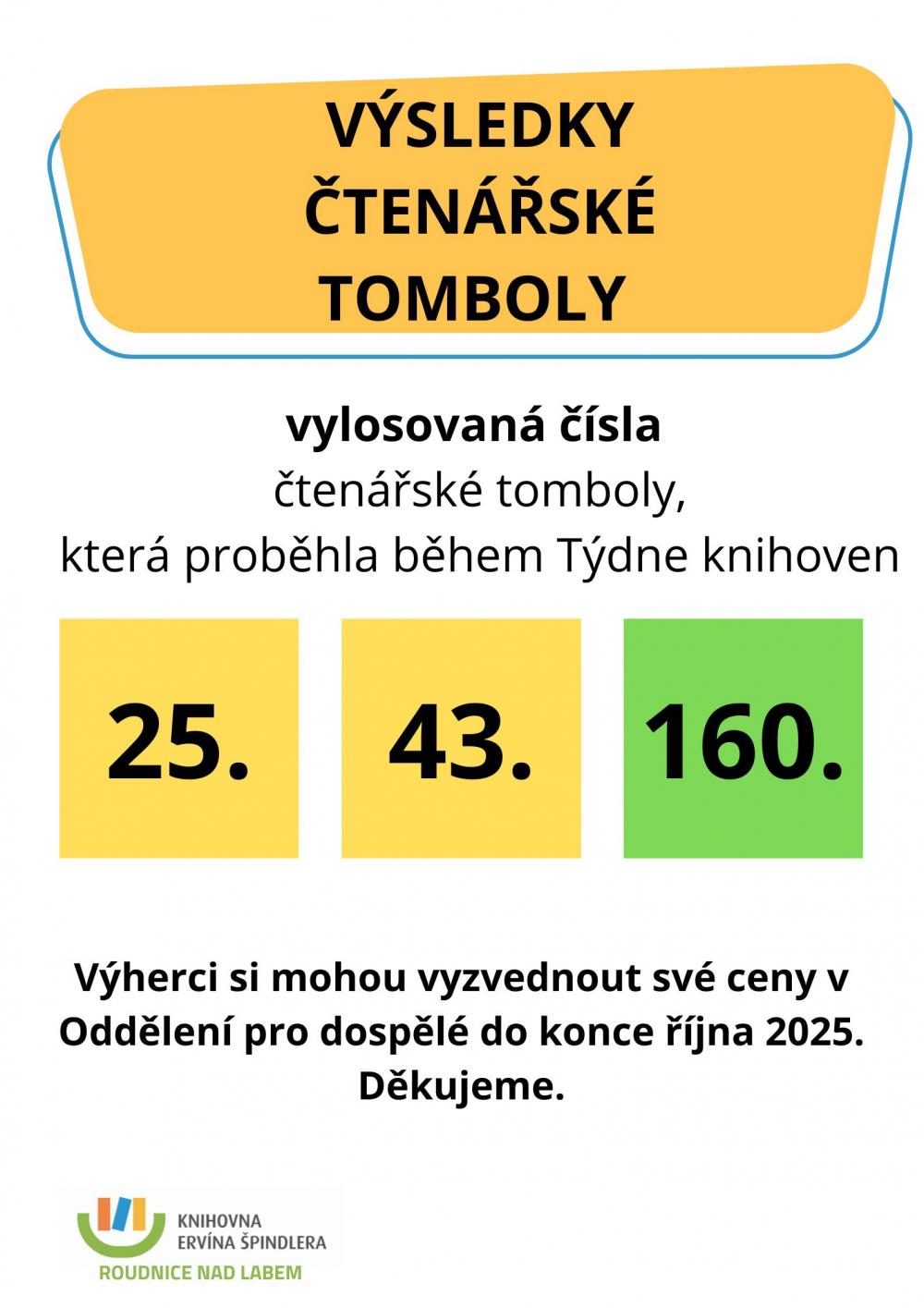 Během týdne knihoven se naši registrovaní čtenáři mohli zůčastnit čtenářské tomboly. Vylosovanými čísly pak jsou: žlutá 25., žlutá 43. zelená 160. Své ceny si vítězové mohou vyzvednout v Oddělení pro dospělé.